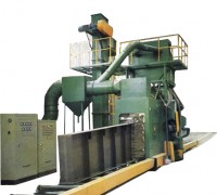 将工件放入橡胶履带滚筒中,操作人员按下“运行”按钮,抛丸室门气动关闭,抛丸清理开始,履带向前运行,工件不断地进行翻滚,高效强力抛丸器将抛丸高速抛射到正在翻滚的工件表面上,工抛丸机件可完全均匀地得到清理。钢丸通过履带上的溜孔流入螺旋输送机,再将钢丸输送到斗式提升机,经斗式提升机提升到分离器,被分离后存储待用。抛丸结束后,抛丸室门自动开启,履带反转,将工件卸出。